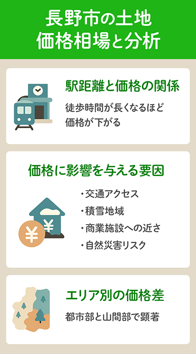 長野市の土地価格は地域によって大きく異なり、価格に影響を与える主な要因は以下の通りです。