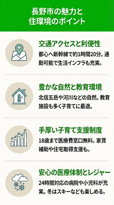 ここでは新築一戸建てを検討される方に向けて、住みやすさ、子育て・教育環境、医療環境という3つの視点から長野市の魅力を整理していきます。