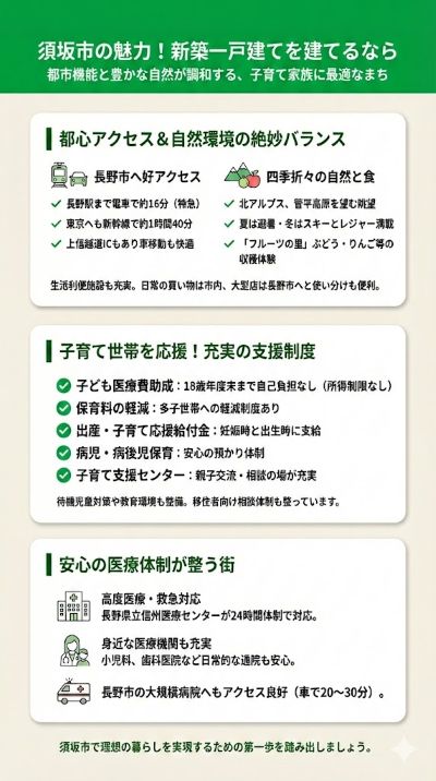 ここでは新築一戸建てを検討される方に向けて、須坂市の魅力を3つの視点から整理していきます。