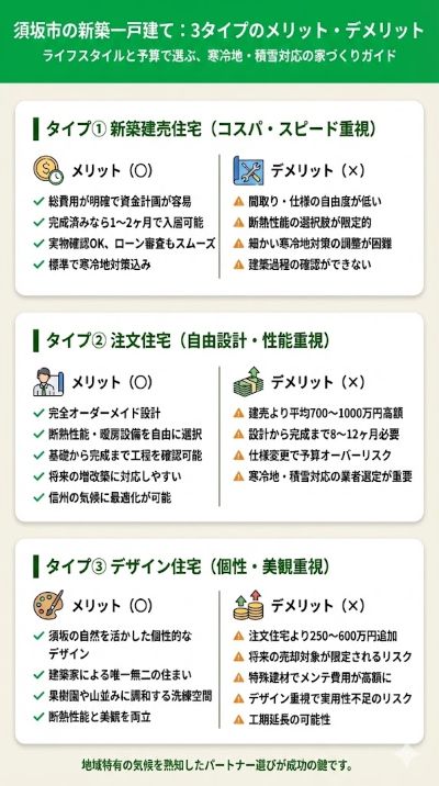 須坂市での新築一戸建て購入では、予算とライフスタイルによって最適な住宅タイプが変わってきます。